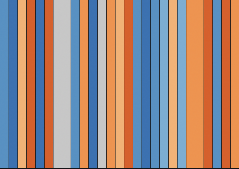 Each stripe represents one year. The colour shows the drought severity based on the Standardised Precipitation Index (SPI). Blue stripes indicate wetter-than-average conditions; orange and brown stripes indicate drought. The visualisation removes all distractions to make long-term drought trends immediately visible.